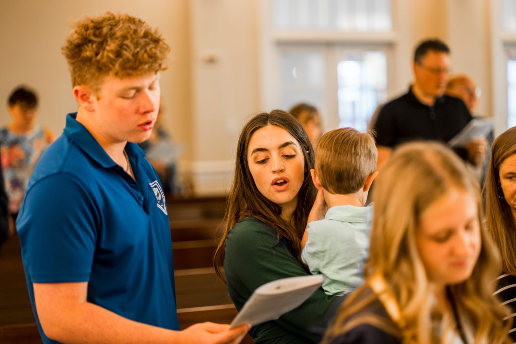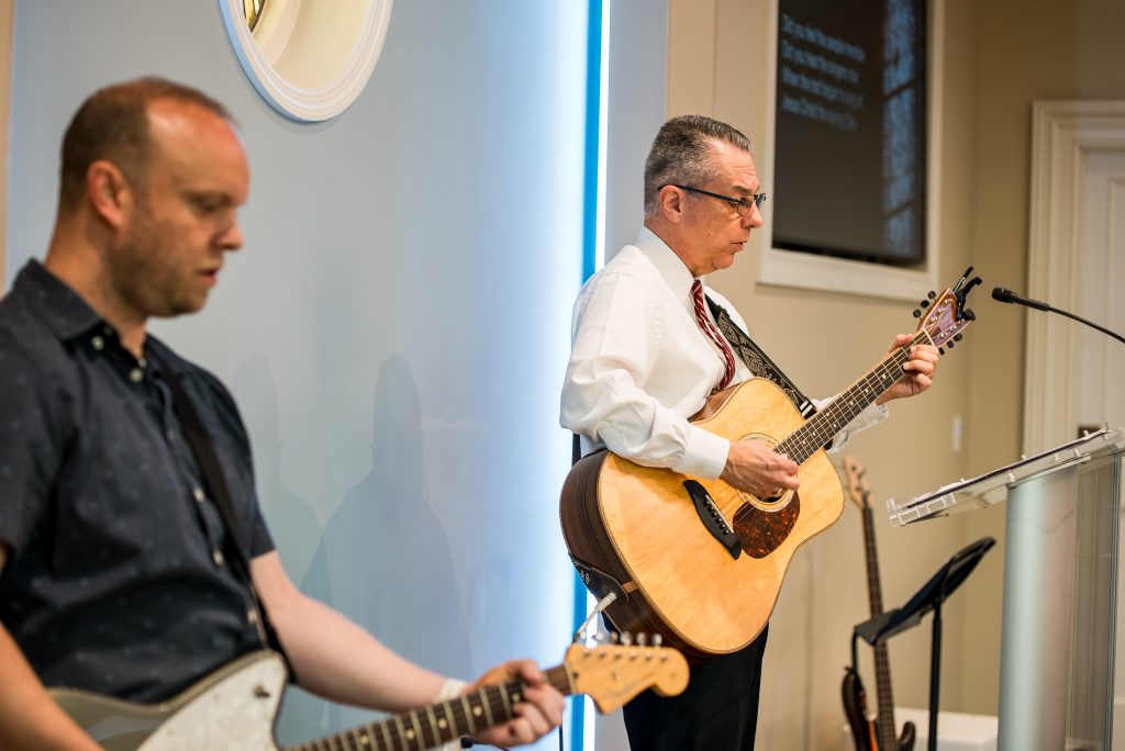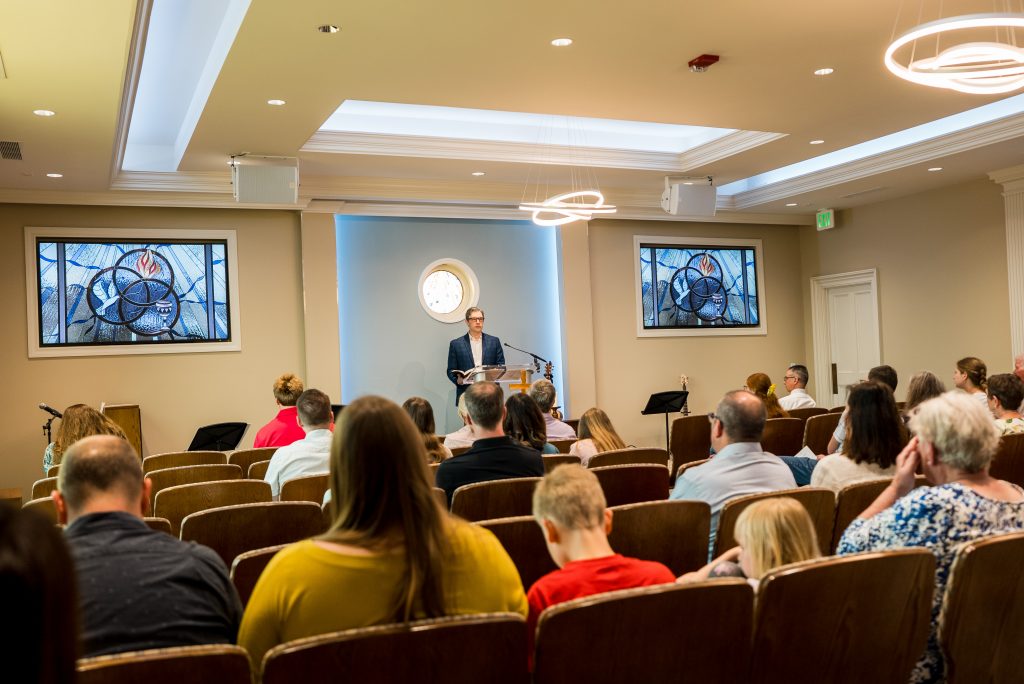 When you arrive, you’ll be greeted at the door and handed a worship guide—a simple roadmap for the service, including the order of worship and the songs we’ll sing. The 9:00 a.m. service lasts about 45 minutes, and the 11:00 a.m. service lasts about an hour.